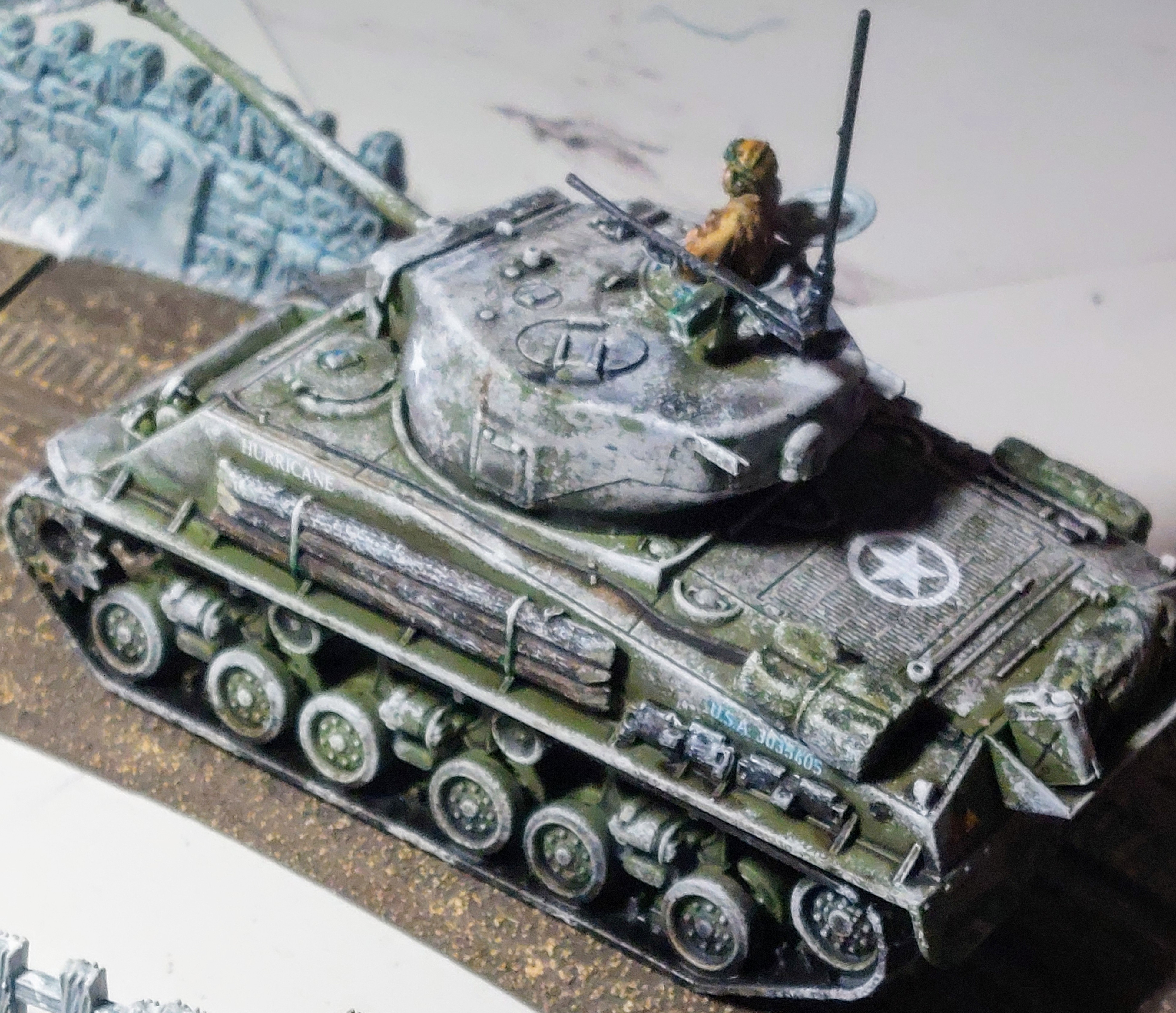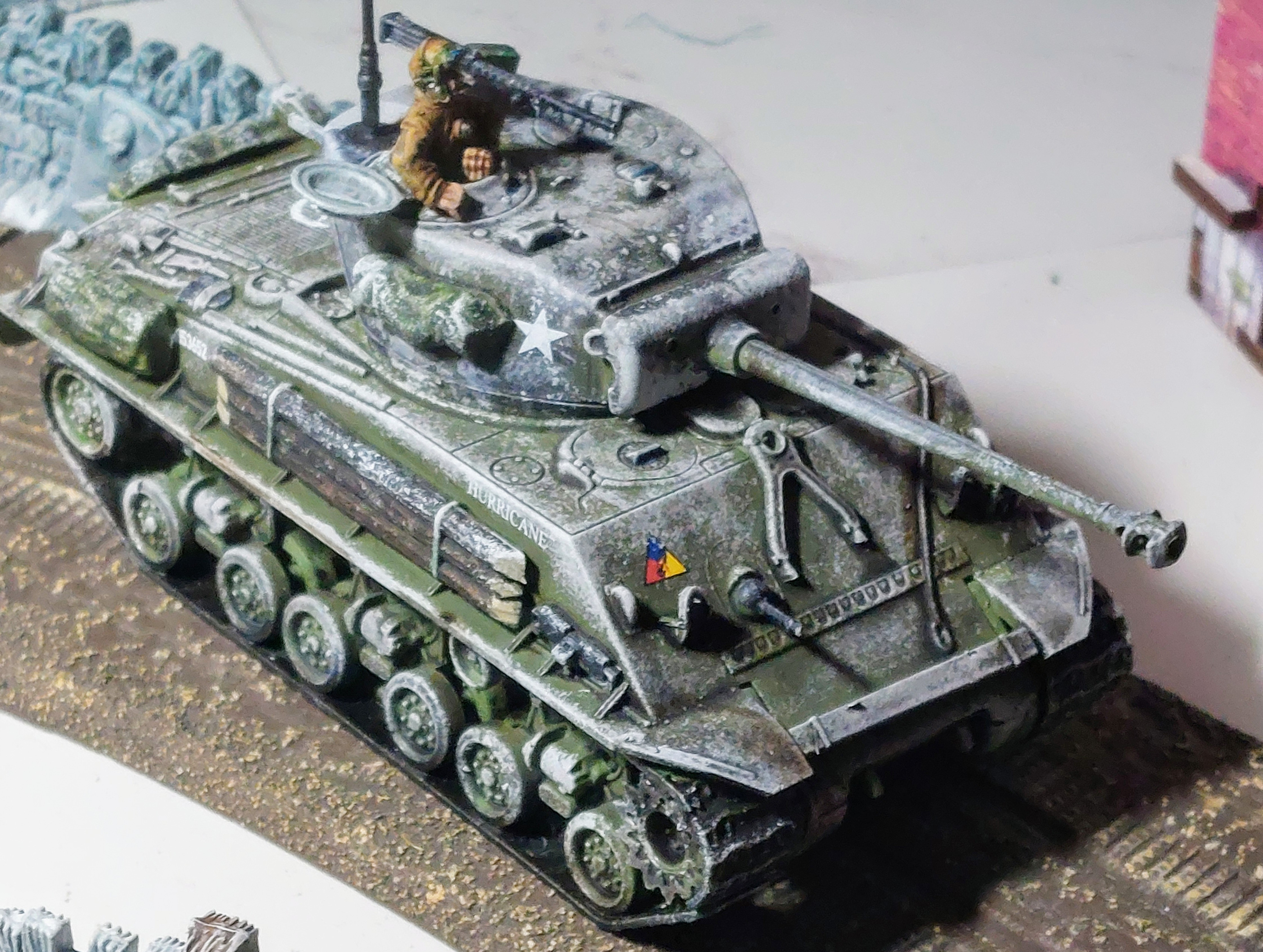 I had meant to put a light sprinkling snow effect , but think left sponge to rough,. I had reasoned that the my favoured unit 11th Armoured Division had been in the process of re-equipping with the new Comets and had been withdrawn for refit. They were one of the few units that Monty had avail in reserve to push into defend the Meuse River During the Ardennes Campaign, They had sent their old Sherman’s into reserve and had not received more than a couple of Comets for training and had to rapidly re-quip with their old tanks when they shove back in nt he line , so I reckoned they would have ha little chance for whitewashing their tanks.