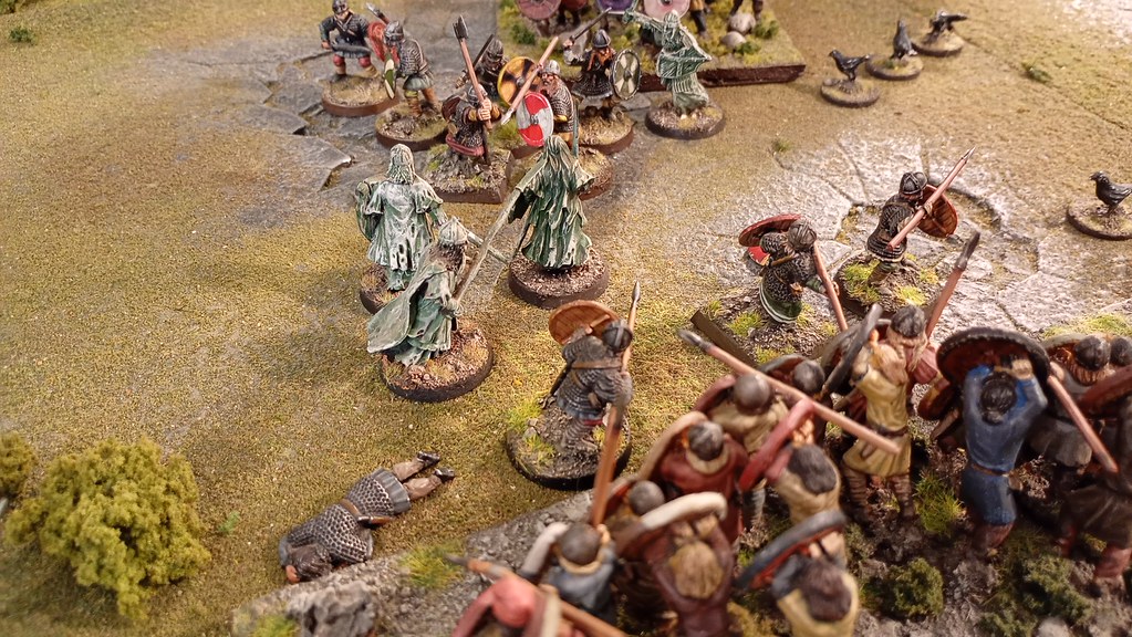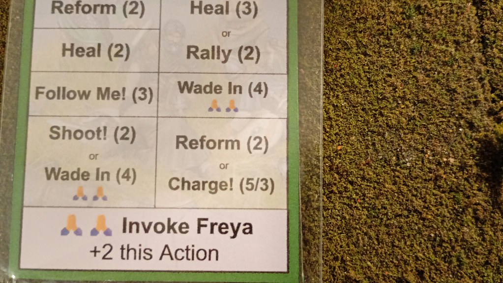 The flaw in Edmund's plan. Fate decreed that, as expected the Welsh Heroes acted first, but when Edmund met Hyffaid and Gwir, Wilfrith couldn't manage to join him. Edmund had two face the two Welsh Heroes alone.Waelstowe is a rules lite game I’ve been creating and modifying for a while now. It is card driven, with the cards showing which Hero activates (is the Focus of the Story) and what actions he can do. In the case of Non Player Armies, it has an ordered list of actions, and the human player (me?) works his way down the list choosing which are the most appropriate.