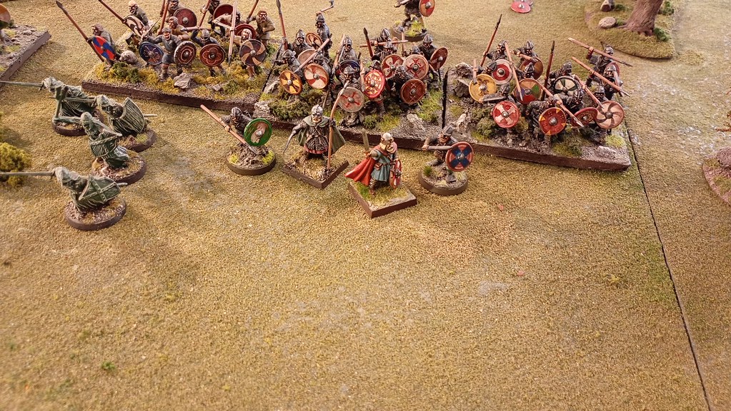 I was the Antagonist (defender if you will) in a solo game against the south Welsh of Hyffaid. I’d lost a couple of solo games already against the Welsh, so I thought even harder about this one. I spotted the way the terrain had been set up and saw my opportunity. If I moved Edwin behind the woods, the Welsh were bound to advanced towards me and their formations break up as they entered the woods. Thus weakened I could send Wilfrith, Edmund’s right hand man to smash the disorganised Welsh.