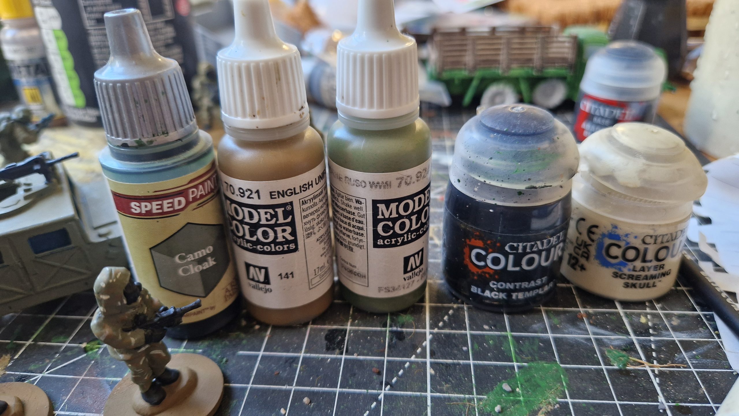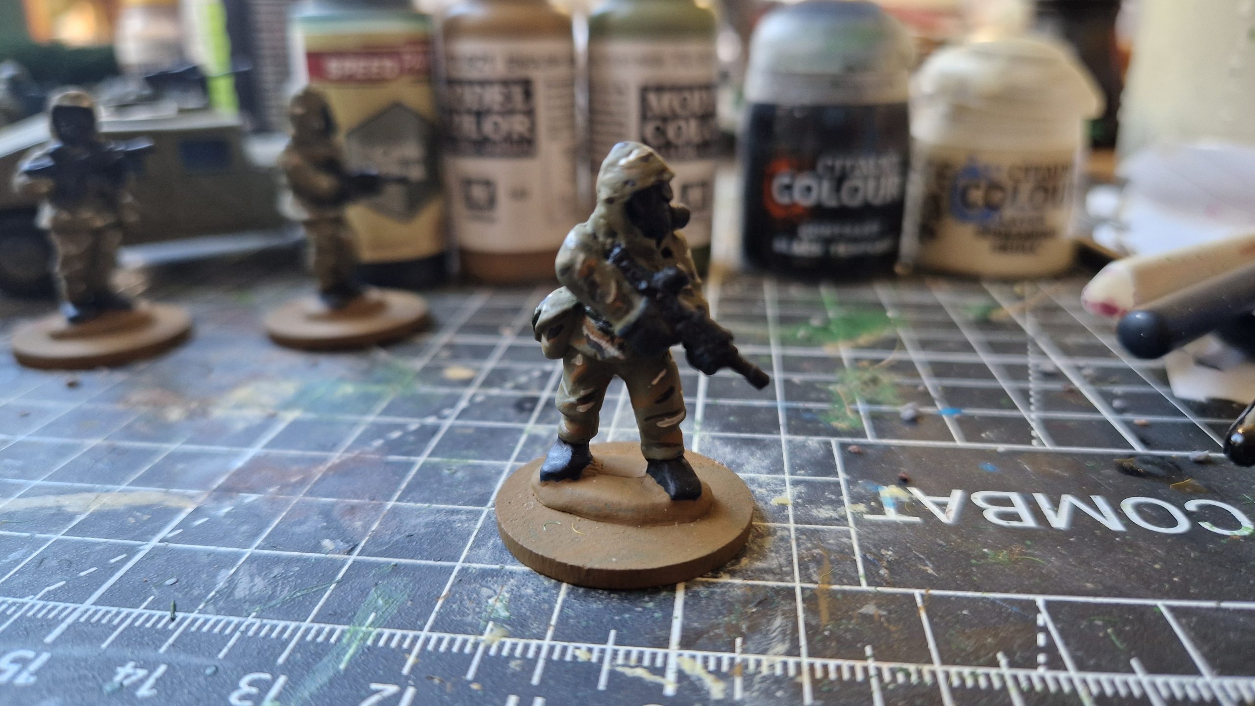 Shot of the paints used for the nbc troops. Started with green overall and black contrast on guns/boots/gloves. Then dashed with brown then cream to create the camo. Also army painter camo cloak on belts/webbing.