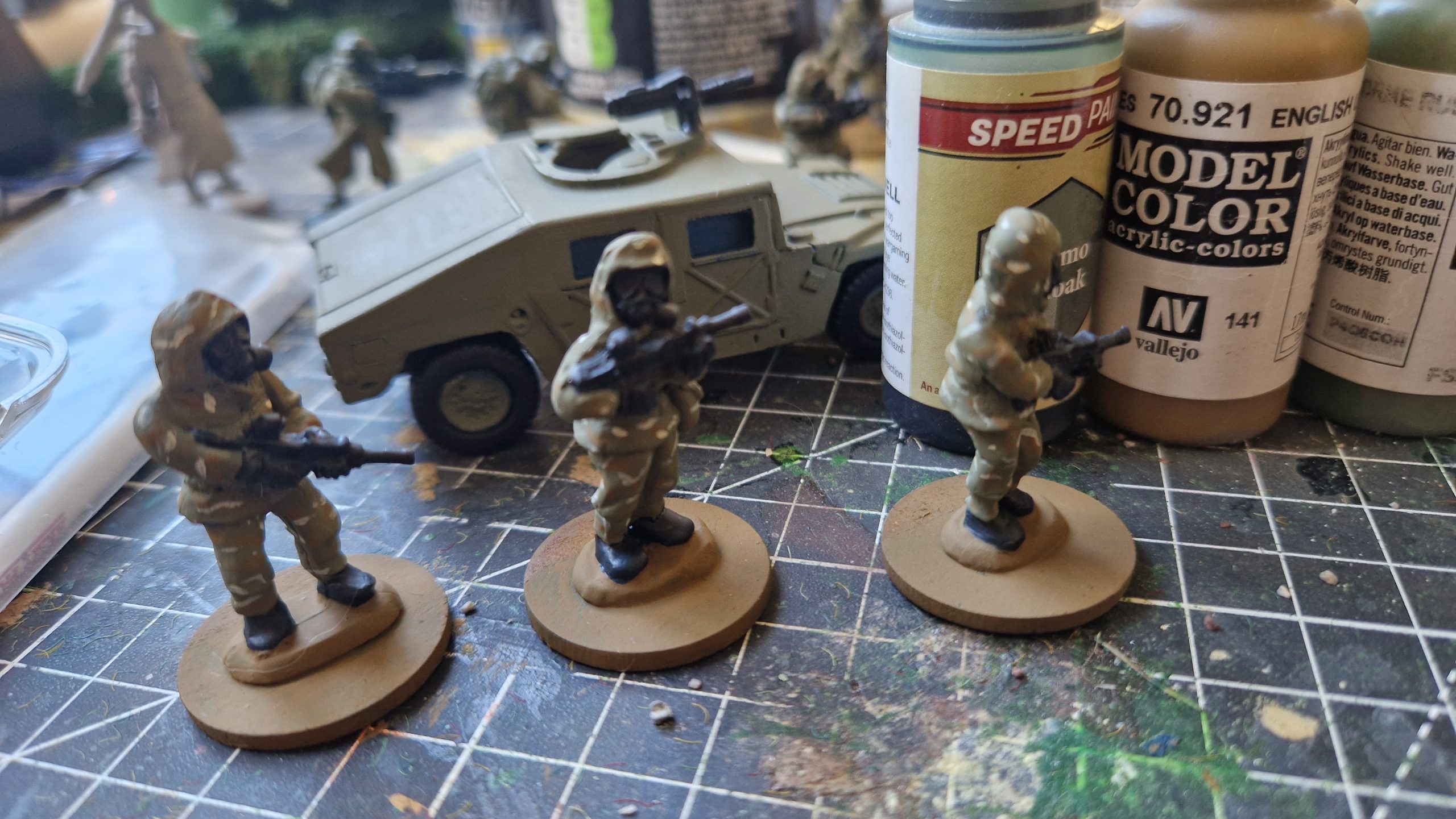 Was originally going to paint them plain but after a Google it seemed they were mostly in camo now. So I’ve been having a go at doing that. The humvee is a project Z spec ops vehicle which I had remembered was lurking in one of the piles upstairs (3 years ago?)